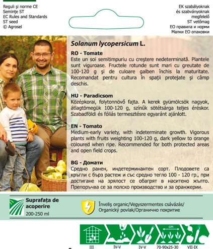 Középkorai, folytonnövő fajta. A kerek gyümölcsök nagyok, átlagtömegük 100-120 g, színűk sötétsárga teljes éréskor. Szabadföldi és fóliás termesztésre egyaránt ajánlott.